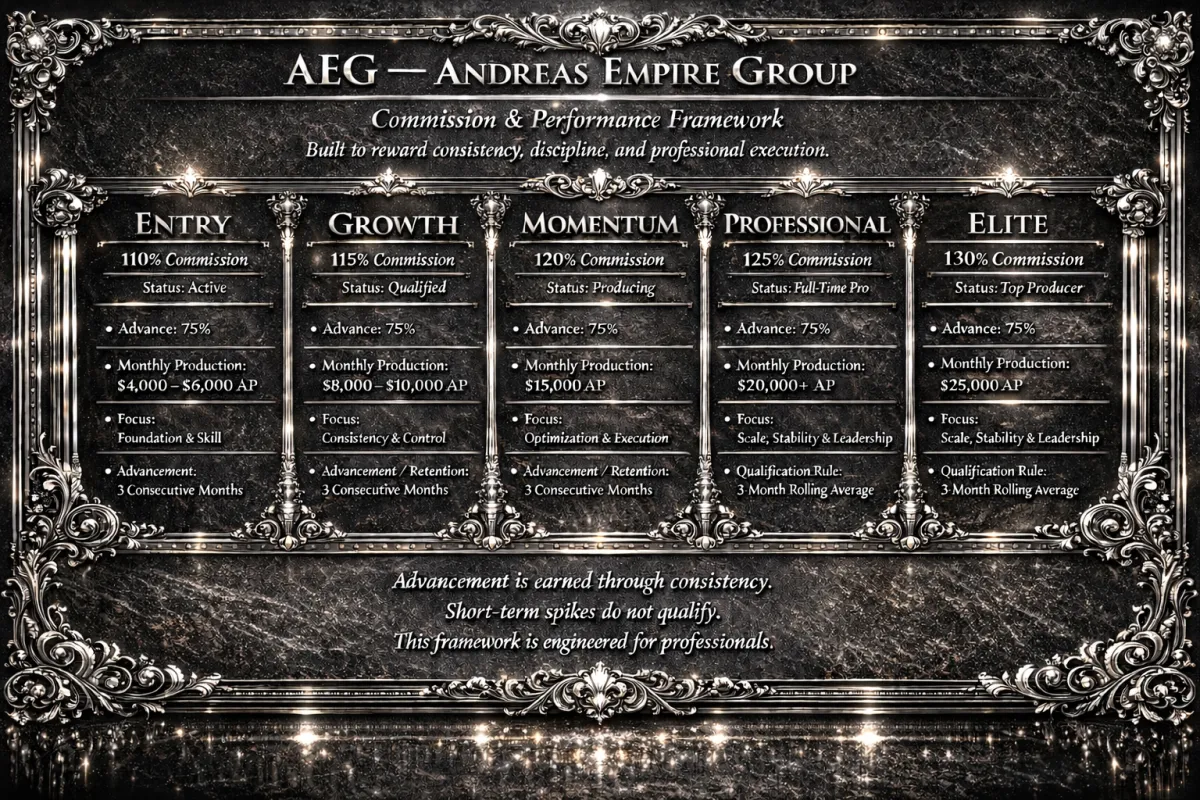 At AEG, commissions don’t grow with time — they grow with output. You enter strong and you advance fast, or you stay exactly where you are. There are no waiting periods, no favoritism, and no safety nets. Production is the only metric that matters. Consistent execution unlocks higher commission tiers immediately, driving real cash flow and rapid income expansion. This platform is not built for dabblers, spectators, or excuse-makers. Advancement is automatic for producers and unavailable to everyone else. If you perform, the system responds — aggressively — inside a private, merit-based structure designed for scale.